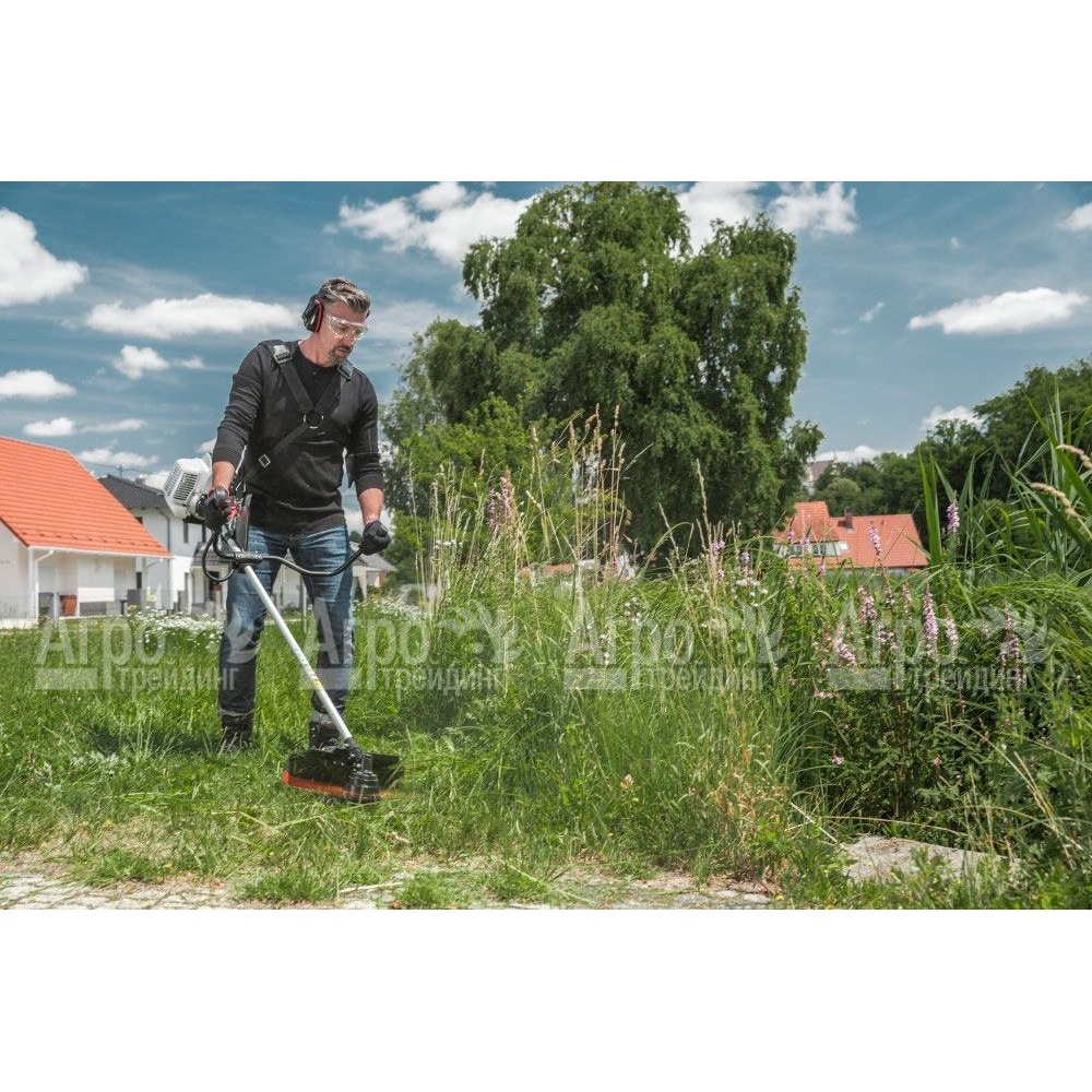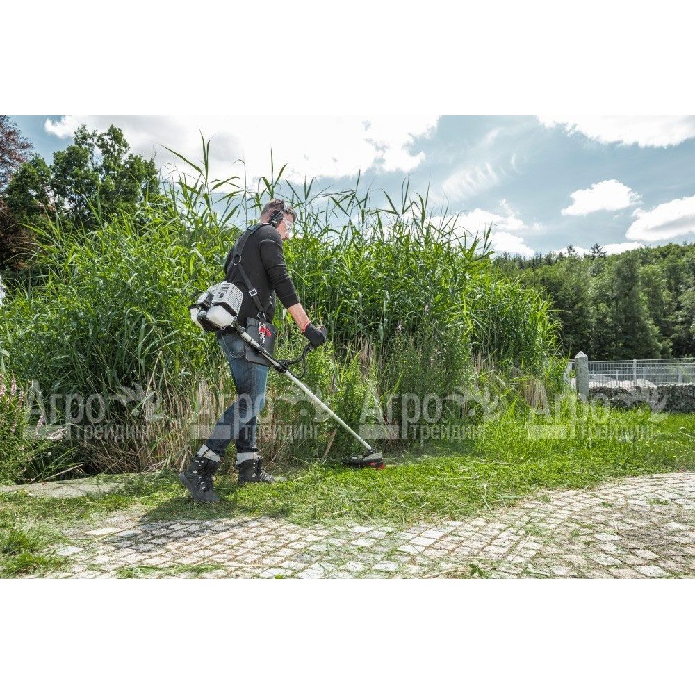 Также к числу достоинств модели относится использование практичной велосипедной рукоятки со встроенными рабочими элементами для точности управления. Кроме того, в комплекте с данной бензокосой имеется катушка Fast & Easy, отличающаяся простотой в применении. Отдельного внимания заслуживает наличие плечевого пояска для оптимального распределения веса оборудования и удобства в эксплуатации.