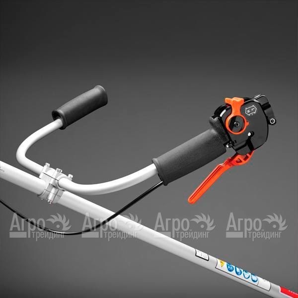 Агрегат отличается экономным расходом бензина и низким уровнем выбросов выхлопных газов. Благодаря наличию системы круиз-контроля с функцией памяти можно регулировать мощность двигателя и уровень шума во время осуществления эксплуатации бензокосы. Эргономическая рукоятка снижает нагрузку на руки оператора и обеспечивает хороший контроль над процессом работы. Левая и правая рукоятки независимы друг от друга, благодаря этому легко выполнять их регулировку по высоте под рост оператора.