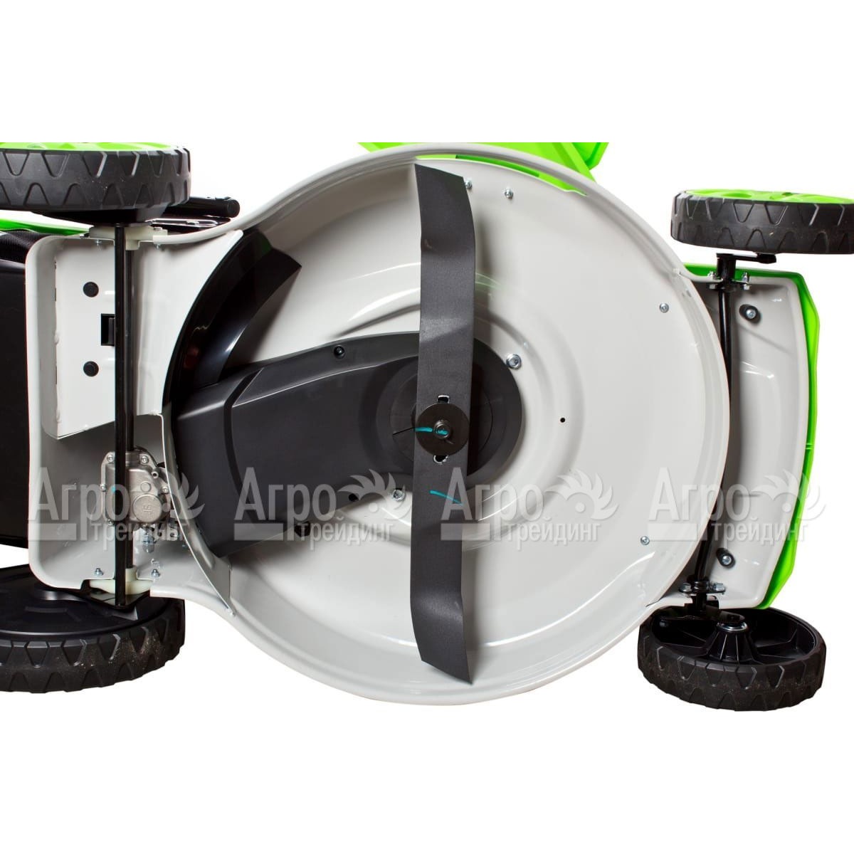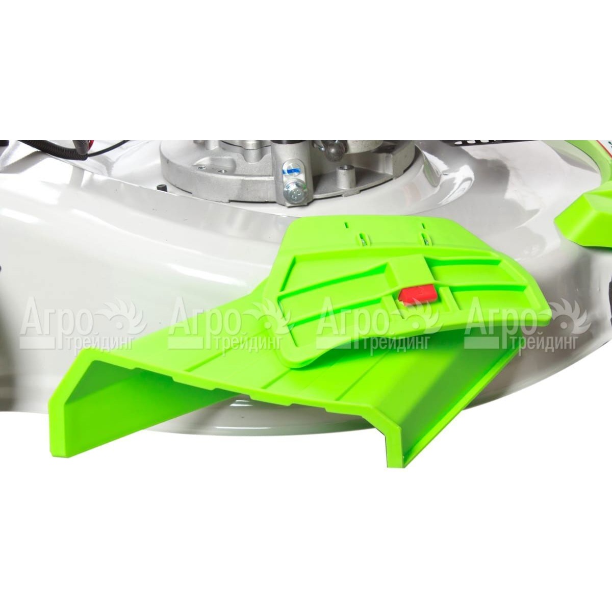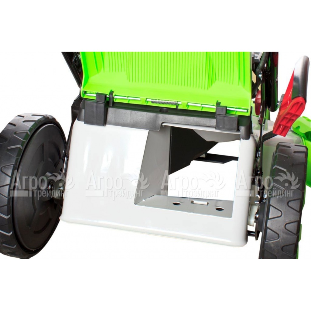 Растительная срезка собирается в травосборнике большого объёма, расположенном на быстросъёмных фиксаторов. Дополнительно имеется функция мульчирования травы и бокового выброса. Высоту кошения удобно регулировать центральным рычагом.
