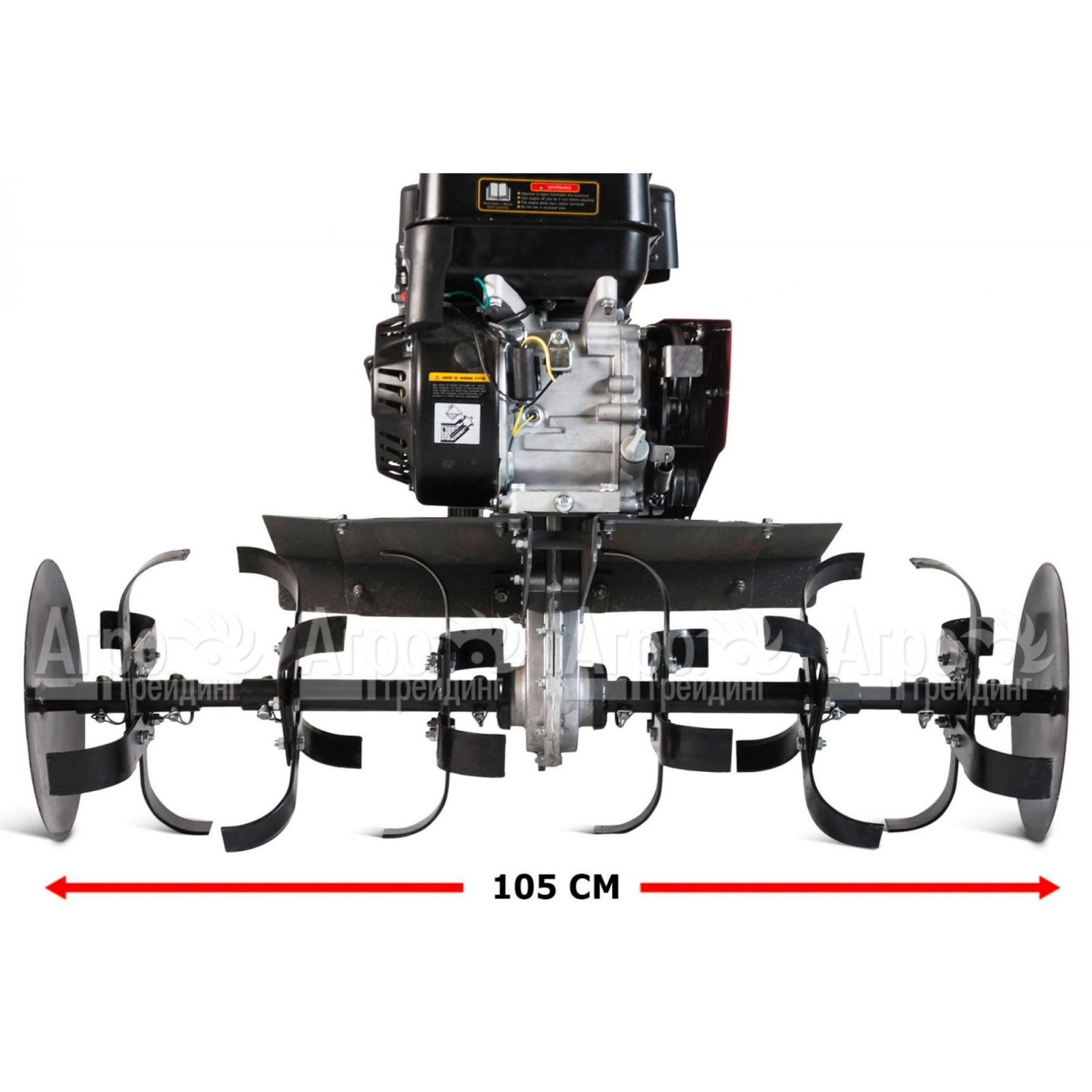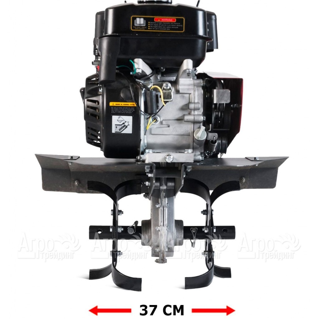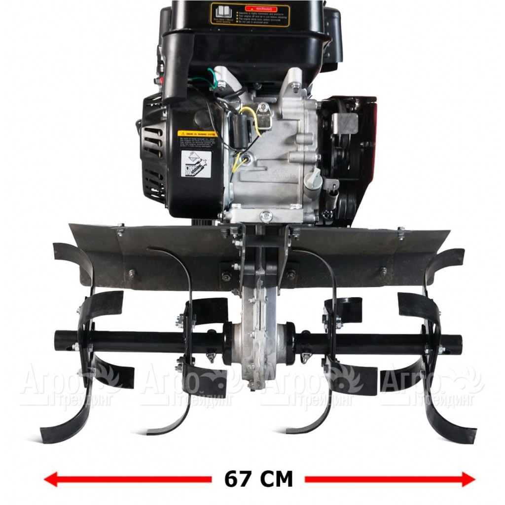 Базовая комплектация: 6 фрез, диски защиты растений, рукоятка в сборе с акселератором и ручкой сцепления в комплекте с тросами, сошник с опорными колесами, труба руля, 2 защитных основных крыла, моторное масло 1 л