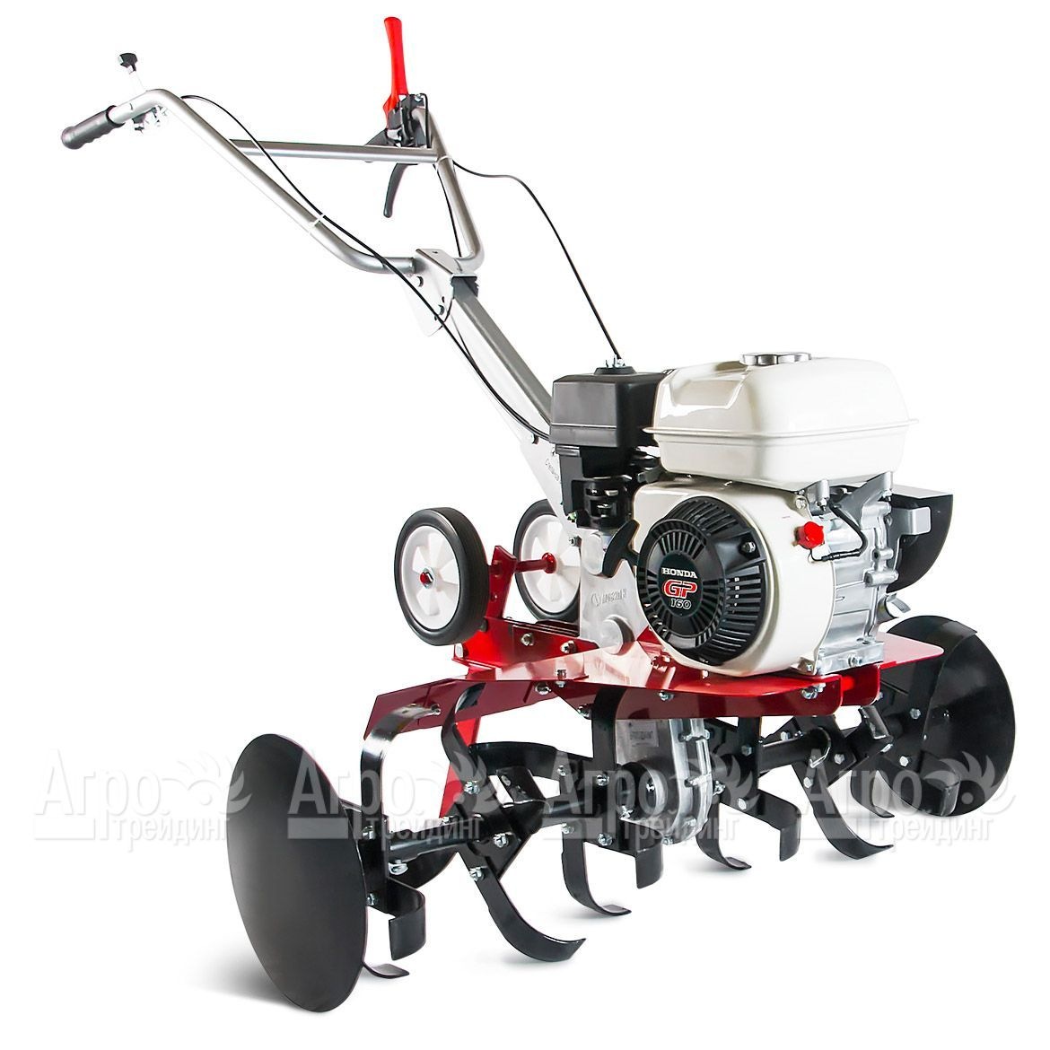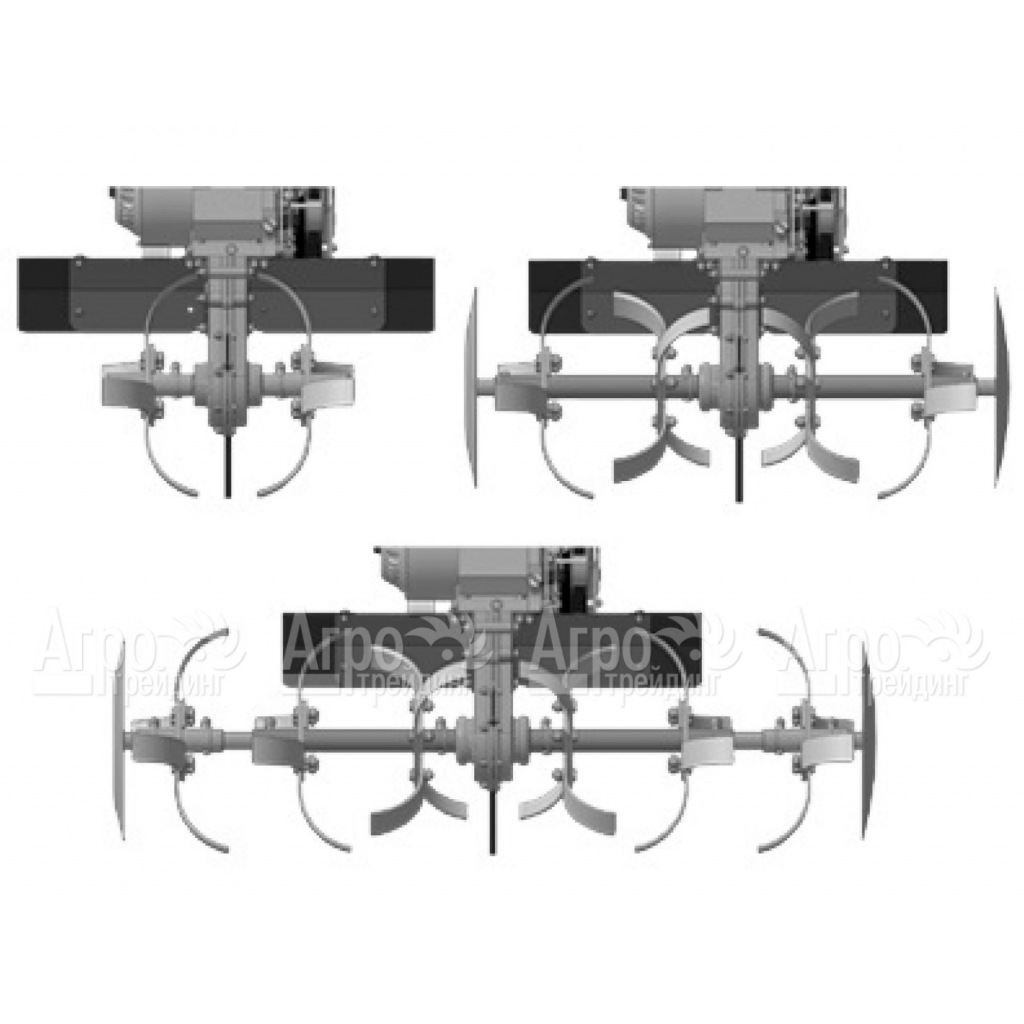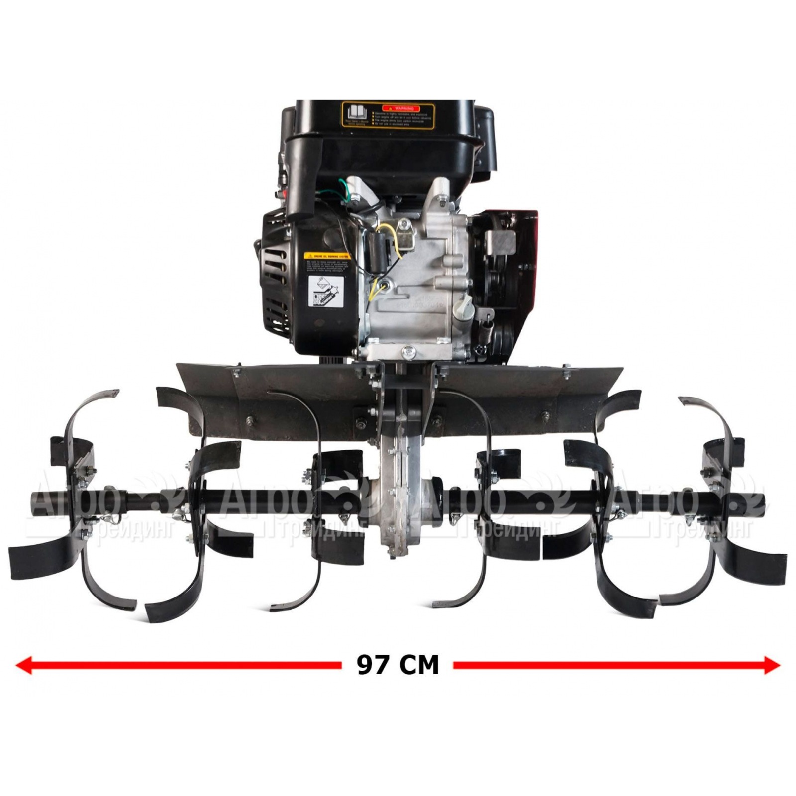 Базовая комплектация: 6 фрез, диски защиты растений, рукоятка в сборе с акселератором и ручкой сцепления в комплекте с тросами, сошник с опорными колесами, труба руля, 2 защитных основных крыла, моторное масло 1 л