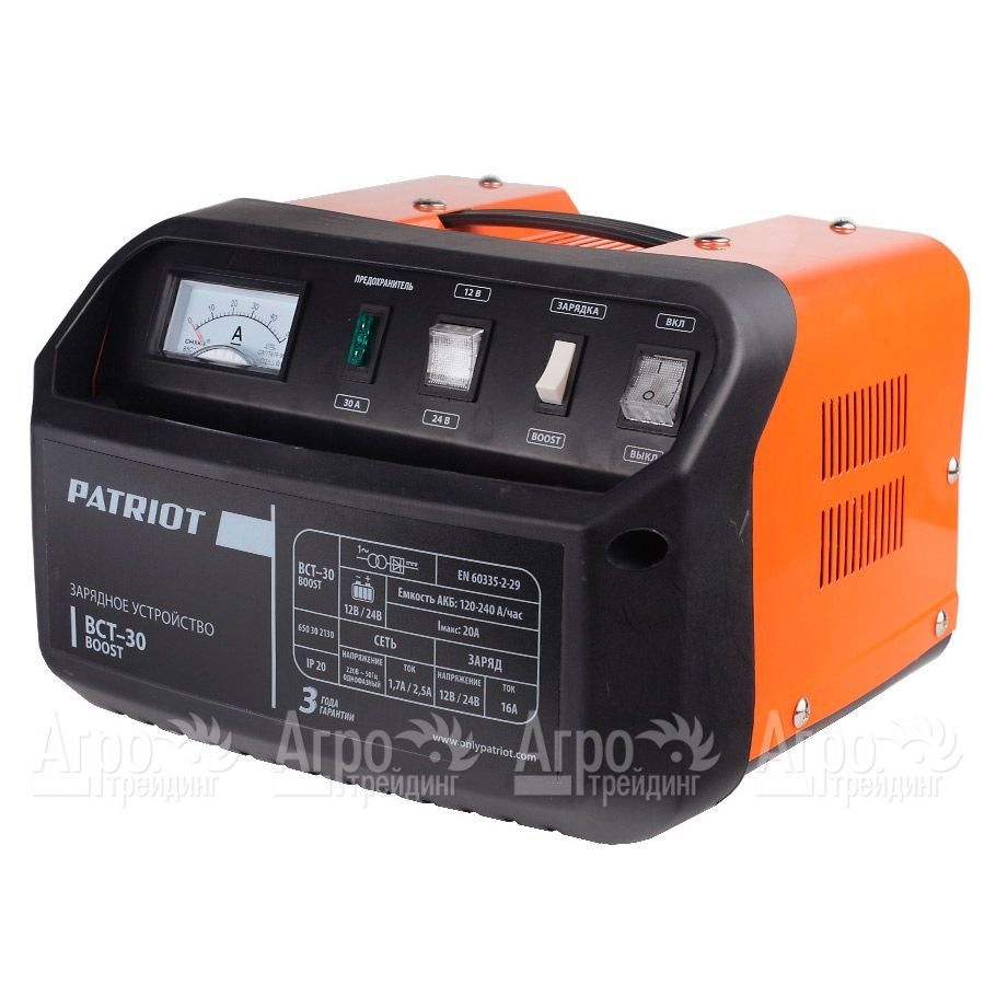 Пускозарядное устройство Patriot BCT-30 Boost пользуется популярностью у владельцев автосервисов и автотранспортных средств. Отличается компактными размерами и малым весом, что способствует удобному хранению в автомобиле. Подобное устройство предназначено для быстрой и эффективной зарядки кислотных и свинцовых аккумуляторов. Использовать данный прибор можно в режиме ускоренной зарядки с предельной силой тока. В целях регулирования напряжения предусмотрен переключатель, расположенный панели управления.